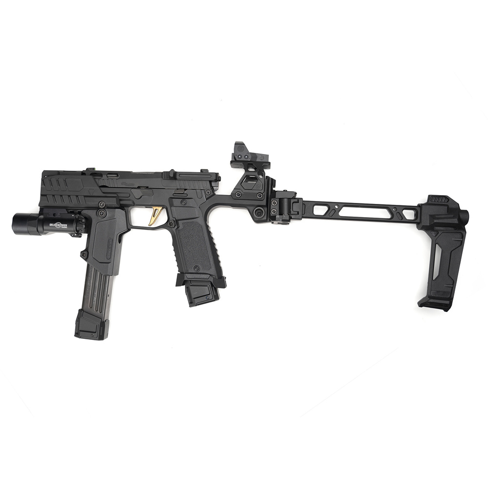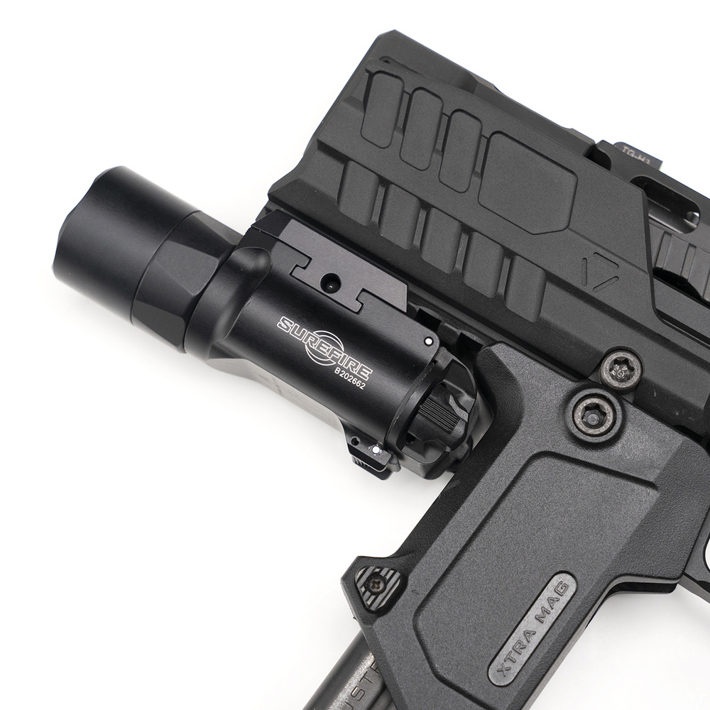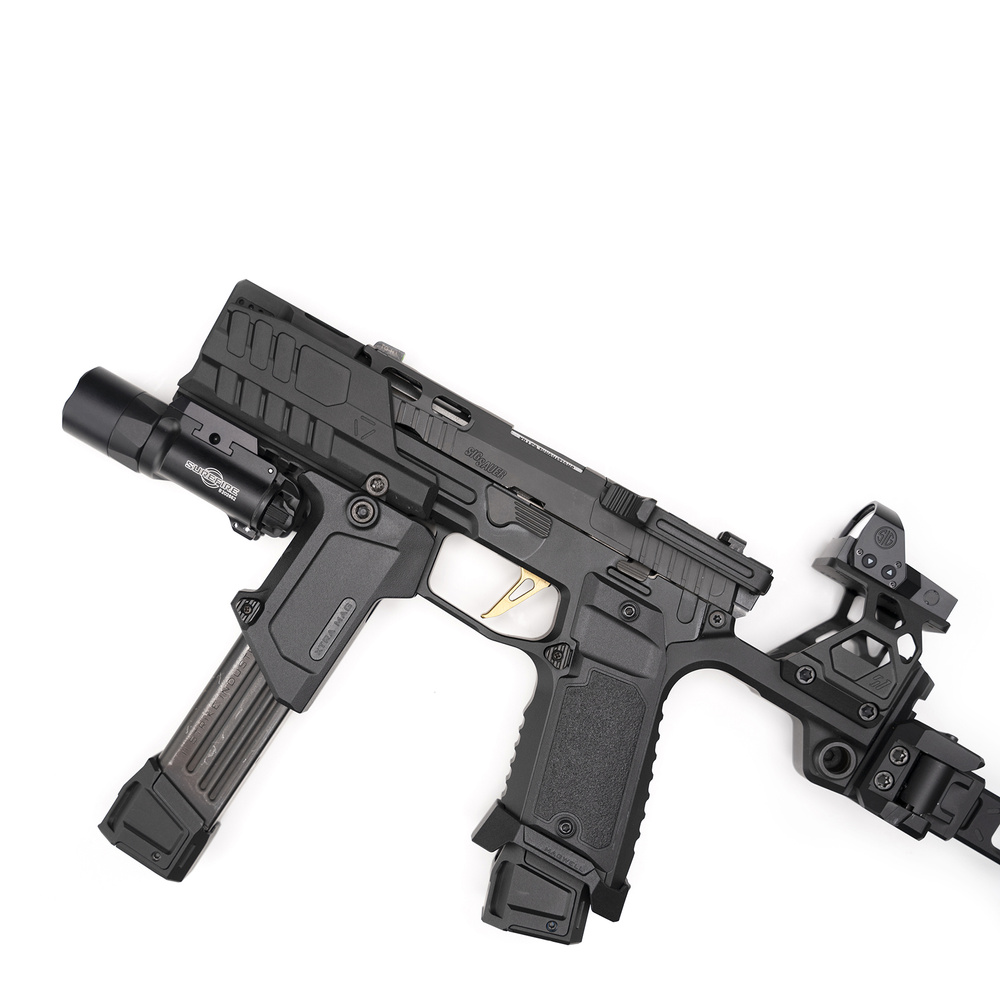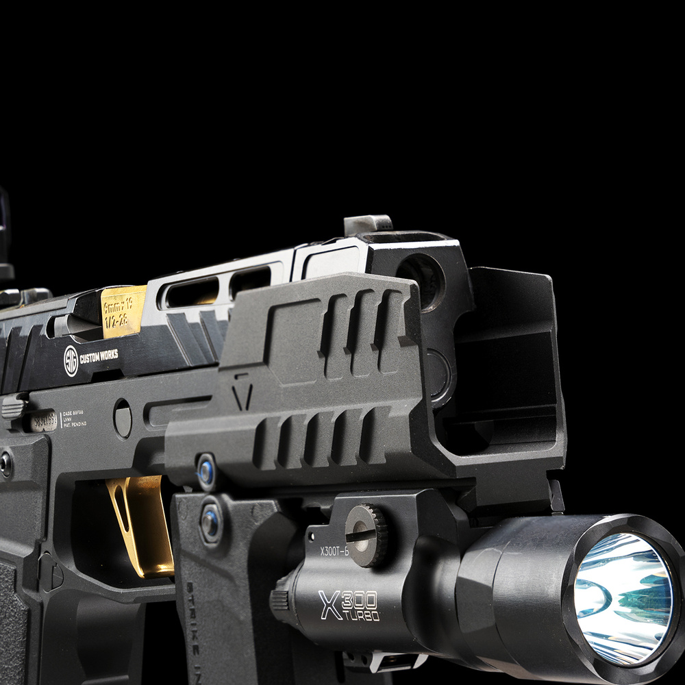 Dank seiner im Vergleich zum Basismodell massiveren Bauweise und der vollständigen Abdeckung des Raums unter dem Lauf isoliert er den Griffbereich der Stützhand wirksam gegen Hitze und Explosionen. Die integrierte Picatinny-Schiene ermöglicht die Montage von zusätzlichem Zubehör, wie z. B. einer Handfeuerwaffen-Taschenlampe. Der Artikel passt auch auf die meisten Pistolenrahmen mit einer maximalen Breite von 27 mm und Picatinny-Schiene.