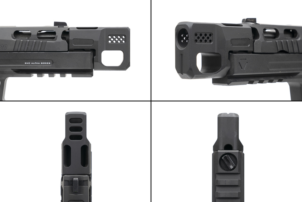 Das Kompensatormodell der L-Version verlängert den Lauf nur um 31 mm, so dass die Waffe weiterhin bequem in einem Holster getragen werden kann. Das Gehäuse ist aus S45C-Stahl gefertigt und für Korrosions- und Hitzebeständigkeit mit QPQ beschichtet. Die Montage erfolgt mit einer einzigen handfest angezogenen Schraube oder einem geraden Schraubendreher, so dass der Kompensator ohne professionelles Werkzeug angebracht werden kann. Die Verwendung eines Gewindelaufs ist nicht erforderlich.