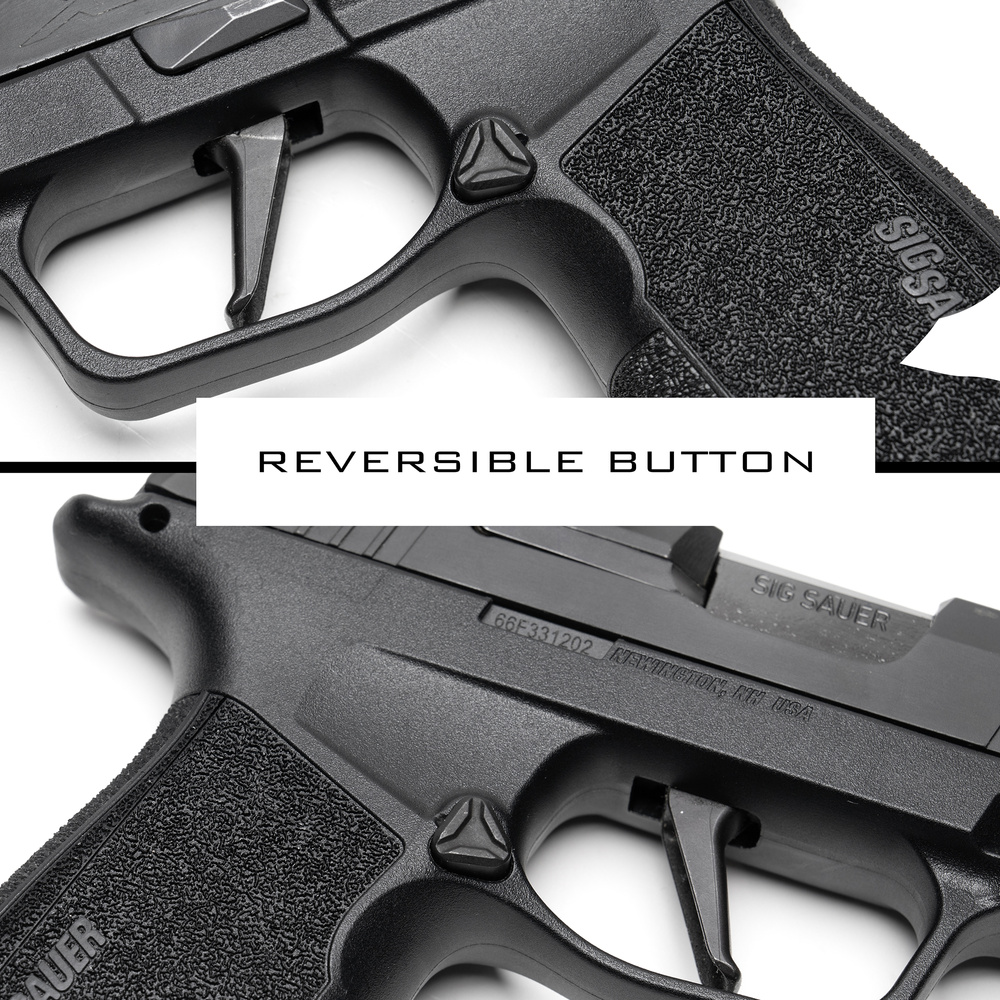 Magazinauslöser für die SIG Sauer P365 XMacro Pistolen. Auch kompatibel mit anderen Modellen der P365 Serie. Verlängerter Knopf aus SUS630 Stahl, mit strukturierter Oberfläche für bessere Zugänglichkeit und stabilen Betrieb. Drop-in-Montage mit werkseitiger Feder und Sicherungsclip. Doppelseitiges Design für bequeme Magazinentriegelung durch Rechts- und Linkshänder.