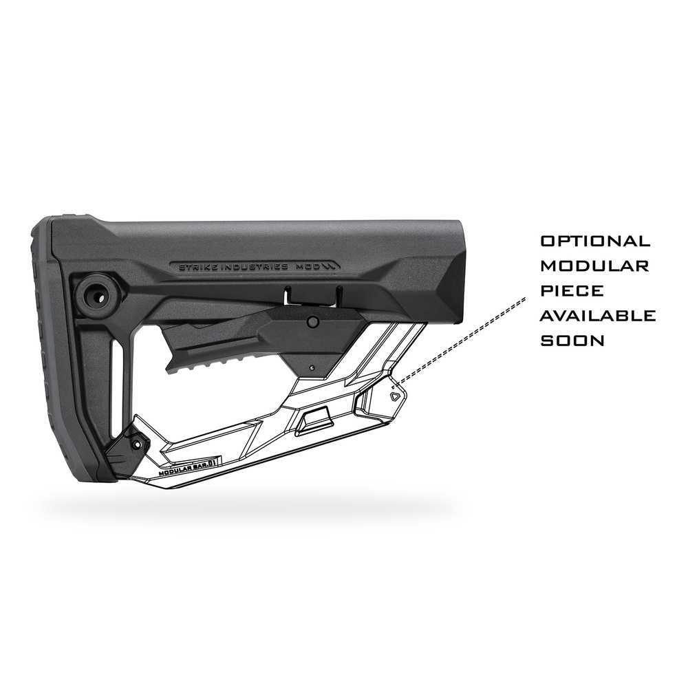 MOD2 stock with adjustable length from Strike Industries. Compatible with the Mil-Spec AR family of receiver extension or the Advanced Receiver Extension SI-AR-ARE-T7-BK and SI-AR-ARE-T7-RED. Made of polymer, it features an extended rubberized foot that will help reduce the effects of weapon recoil. This will allow the user to use the weapon for longer periods of time with greater comfort.