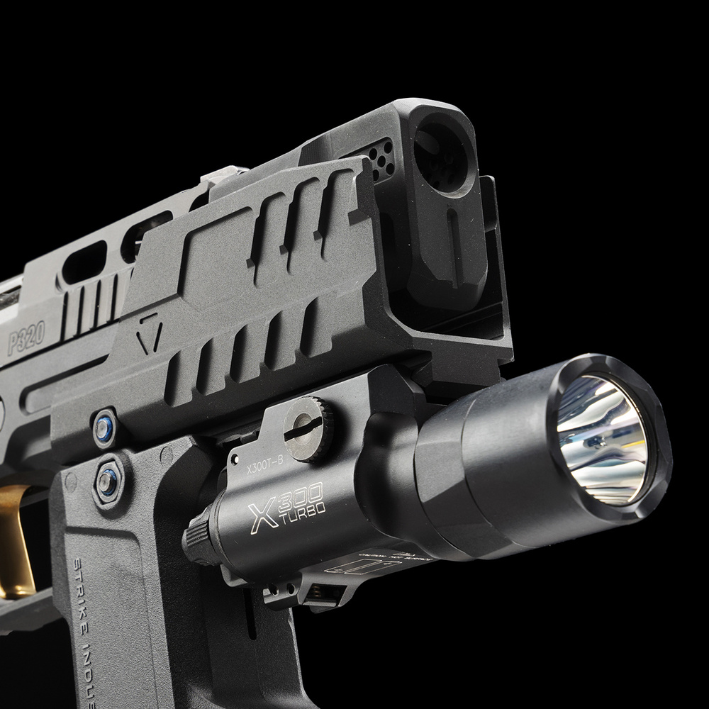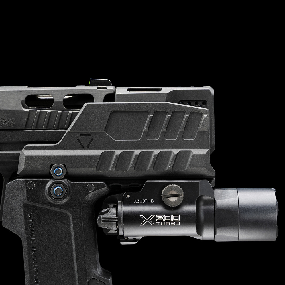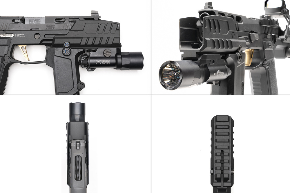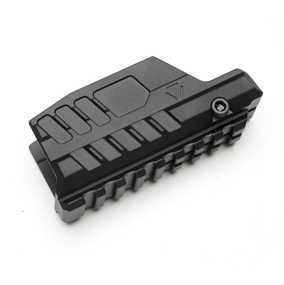 Thanks to its more massive design, compared to the base model, and full coverage of the space under the barrel, it effectively insulates the grip zone of the supporting hand from heat and blasts. The integrated Picatinny rail allows mounting of additional accessories, such as a small arms flashlight. The item also fits most pistol frames with a maximum width of 27mm and Picatinny rail.