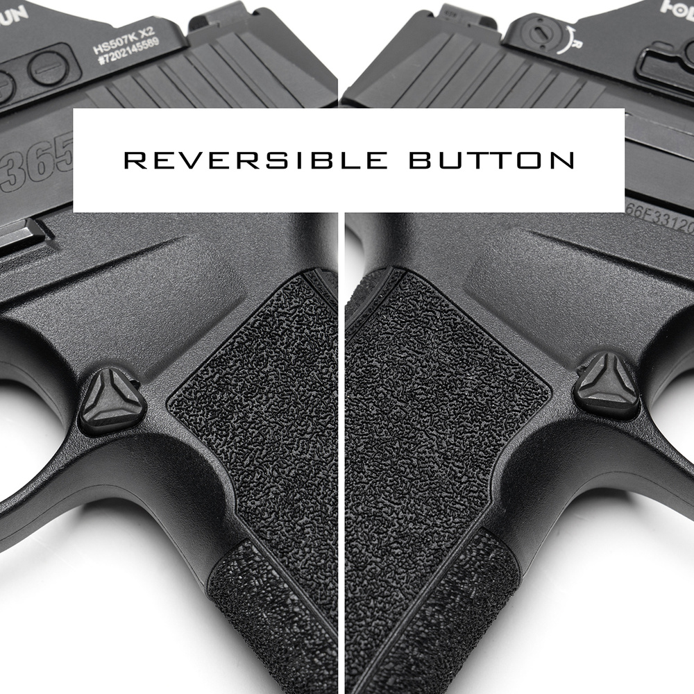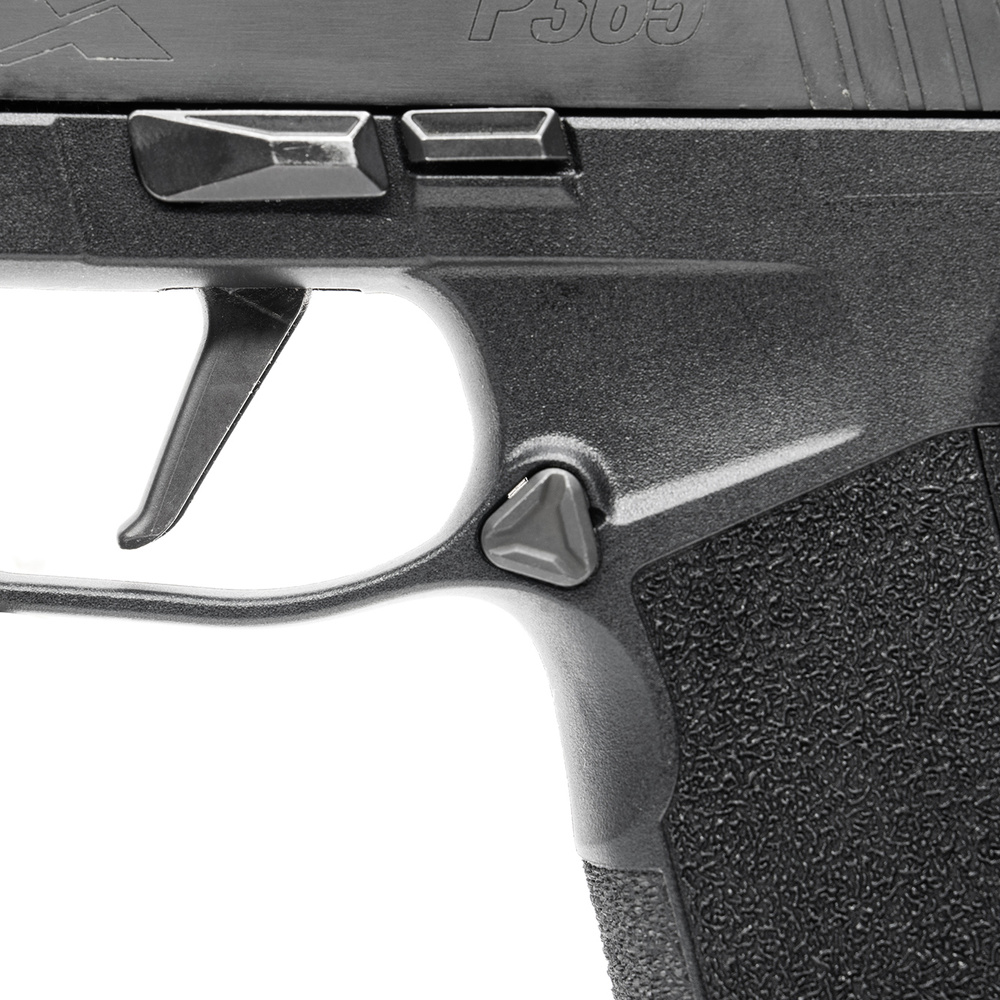 Magazine release designed for SIG Sauer P365 XMacro pistols. Also compatible with other models of the P365 series. Extended button made of SUS630 steel, with textured surface for better accessibility and stable operation. Drop-in mounting with factory spring and locking clip. Double-sided design for convenient magazine release by right- and left-handed users.