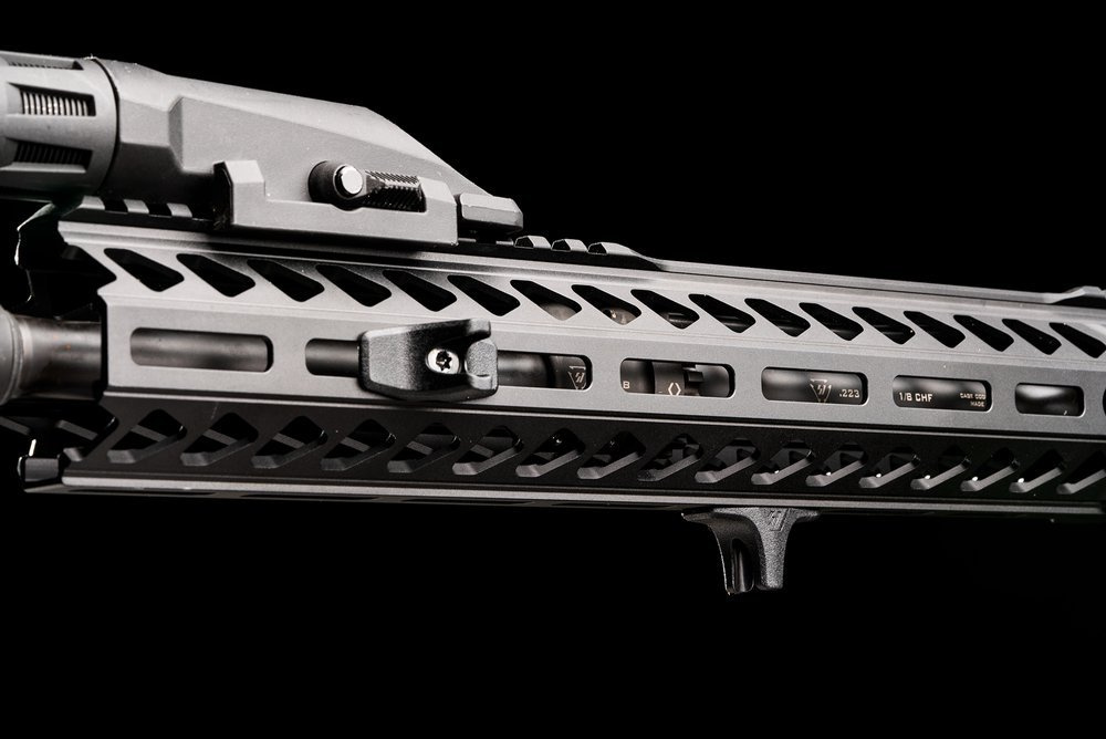 Bikini Hand Stop zrobiono z lekkiego polimeru, a uniwersalna obustronna konstrukcja umożliwia montaż w dowolnej pozycji. Chwyt jest kompatybilny z szynami M-LOK.