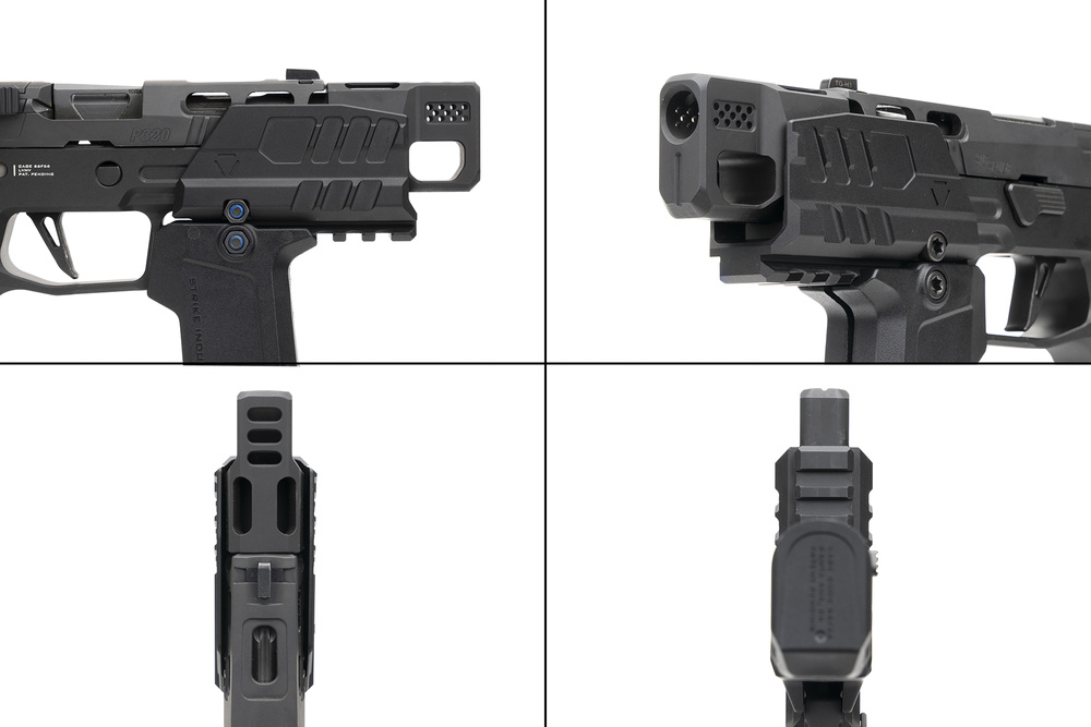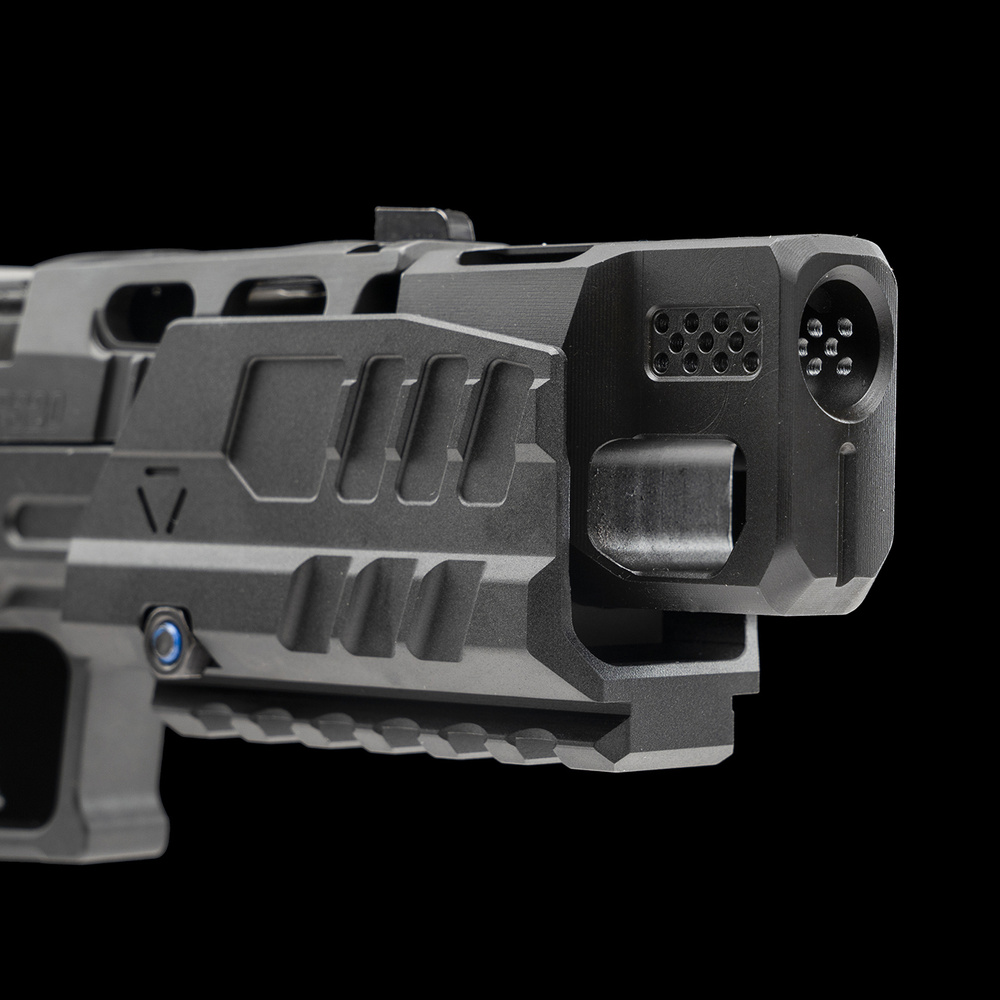 Osłona wylotowa SI‑SMC‑BS‑S zaprojektowana dla SMC‑Alpha i SMC‑Bravo. Montowana na szynie Picatinny, osłona posiada szynę montażową w tym samym standardzie, by umożliwiać montaż kolejnych akcesoriów. Przesłania przestrzeń przed kciukiem i odprowadza gorące gazy w przód oraz w górę, zmniejszając dyskomfort i ryzyko poparzeń dla strzelca.