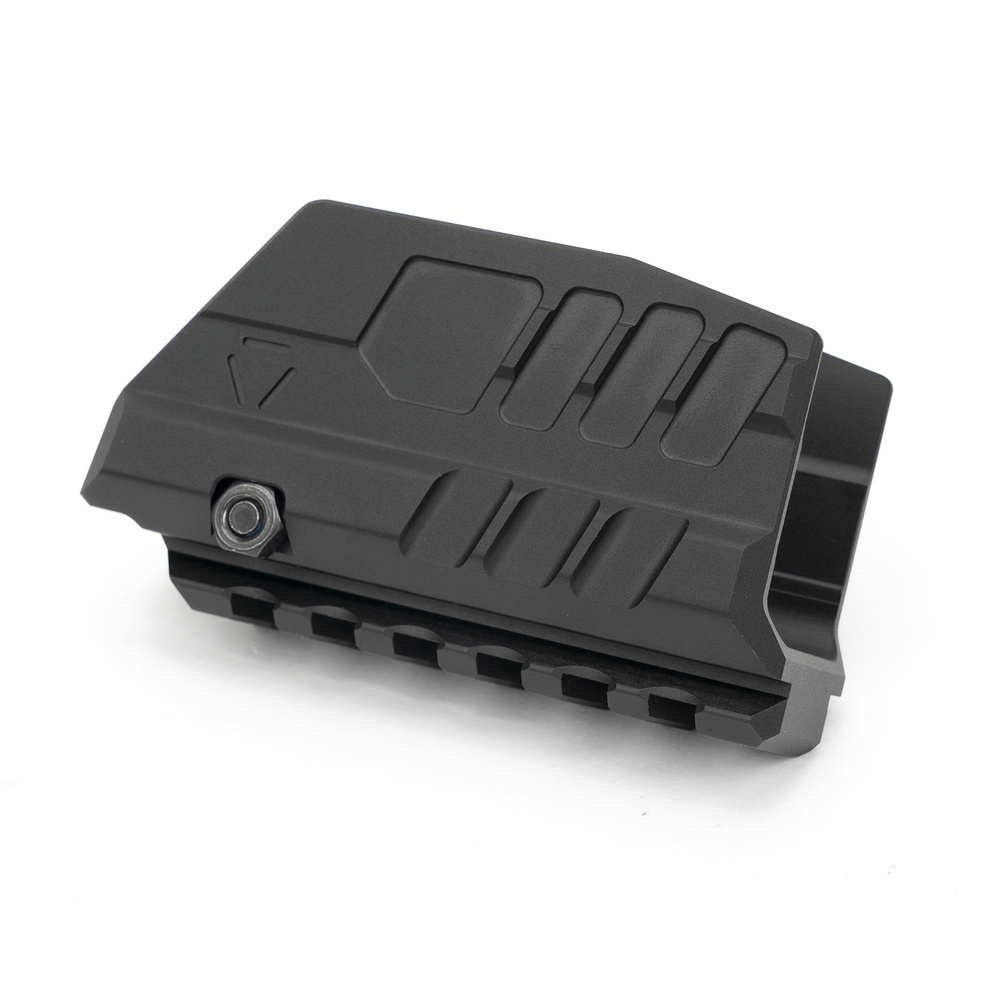Osłonę wykonano z frezowanego aluminium 6061‑T6, które szybko odprowadza przyjęte ciepło. Element pasuje nie tylko do szyn SMC‑Alpha/Bravo, lecz także do większości ram pistoletów o maksymalnej szerokości 27 mm i szyną Picatinny.