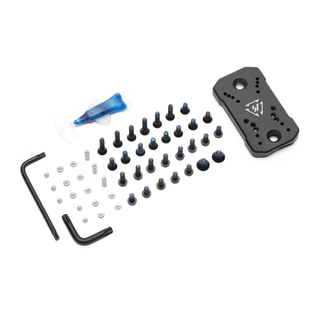 Do zestawu dołączono bogaty asortyment śrubek do mocowania, a także klej do gwintów Loctite. Montaż, dzięki swojej niskiej wysokości, poniżej 1 cm, nadaje się do konstrukcji w których użytkownik chce zachować niski profil broni.